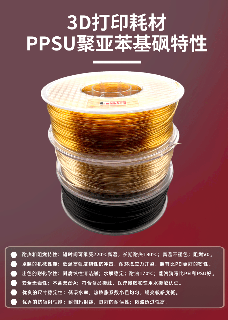 另外因为ppsu特种塑料本身具备高耐热、难燃、耐化学溶剂、高机械强度、尺寸稳定、生物相容性、高洁净度等特点,所以高性能ppsu耐高温特种3d打印耗材通常用于的电子行业、军工航天、汽车制造、石油化工、矿业、纺织机械、医疗食品等领域等。
